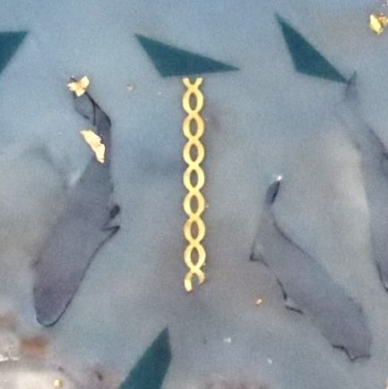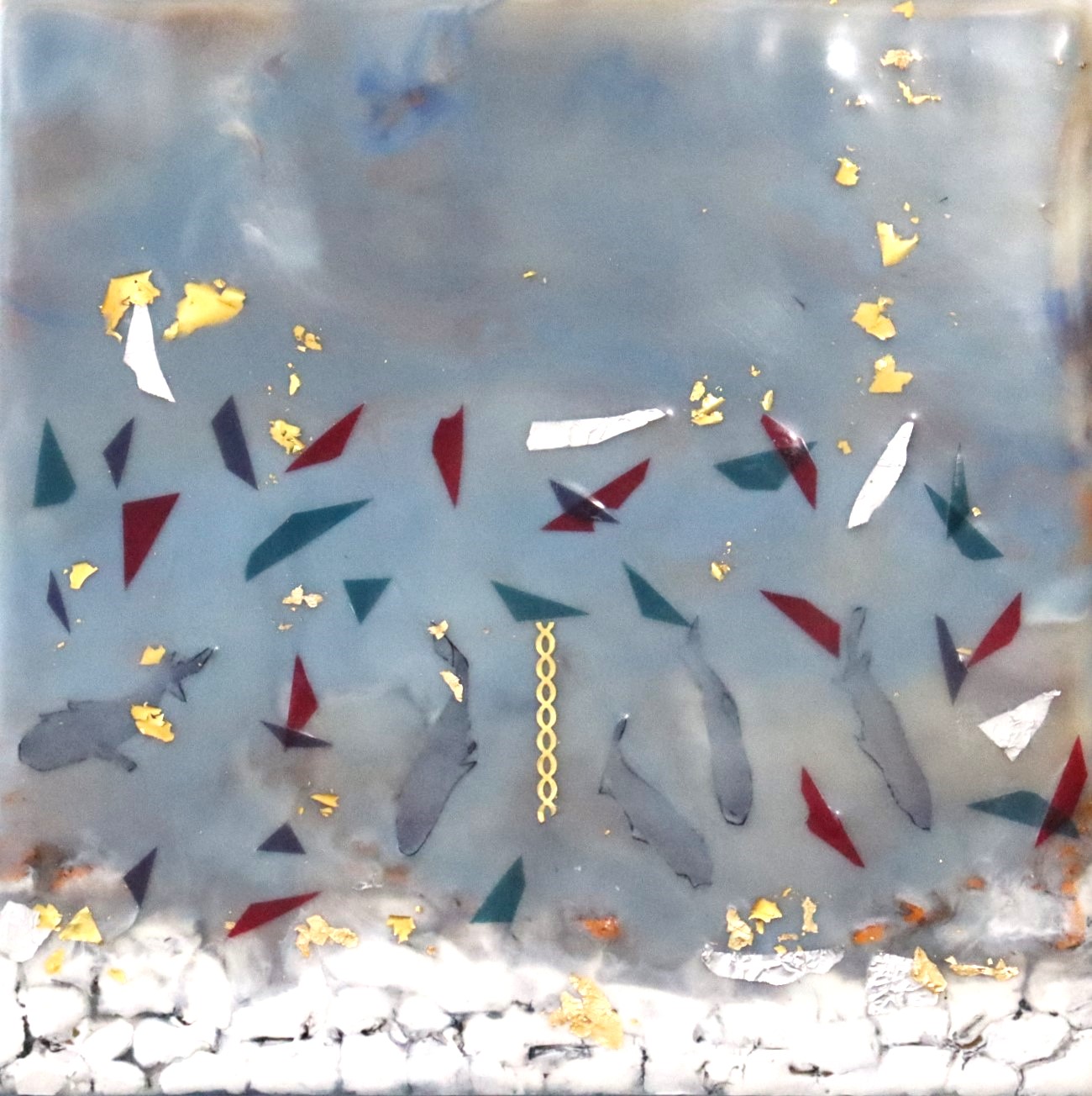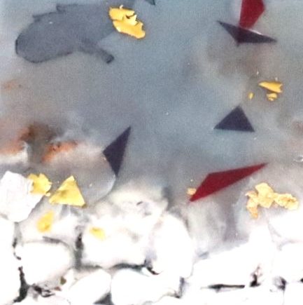 Painting, encaustic technique, beeswax, plastic and gold leaf on a wooden panel.